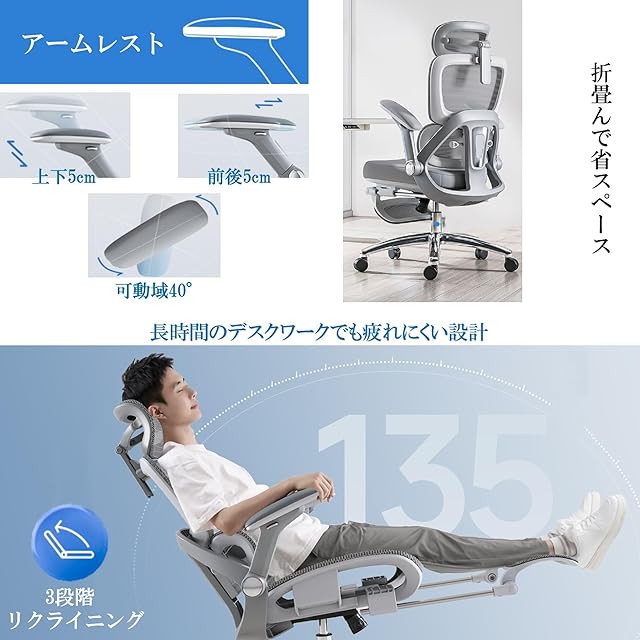 【機能】長時間の作業をサポートする機能を多数搭載。リクライニング、ロッキング機能、背凭れと座面奥行が調整可能、腰が楽になるランバーサポート、折りたためる8Dアームレスト、フットレスト・ヘッドレスト付き。
