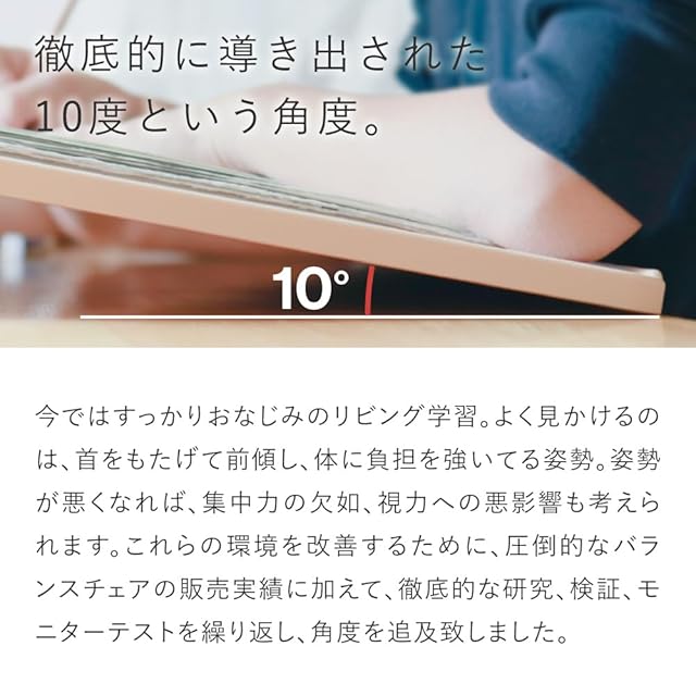 【目にやさしい学習台】机の上に置いて高さを上げることができ、天板に10度の傾斜を持たせることで首の傾斜を軽減し、目や首への負担を軽減します。デクスワークで首がもたげて前傾し体に負担を強いてる姿勢になっている方に。