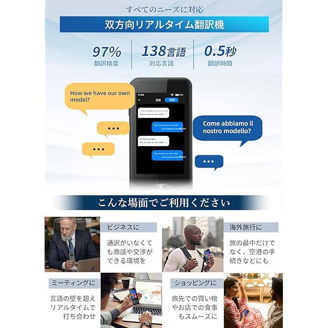 Wooask W10写真翻訳機能付の音声翻訳機です。翻訳言語は138言語(56アクセントを含む)を双方向リアルタイムに翻訳できます。Wooask翻訳機は世界の70か所に翻訳サーバーを配置。世界のどこでも使える0.5翻訳の速度と安定性を提供します。(翻訳速度:最大0.5-3.0秒)