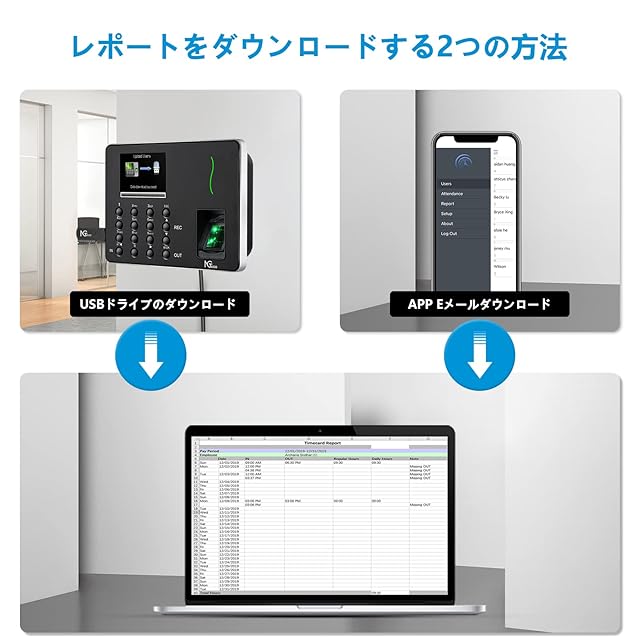 【APPとPCの両方に対応】:NGTeco生体認証指紋タイムレコーダーには柔軟なスケジュール調整可能。支払期間、出席ルールの設定、ユーザーの登録、不足しているパンチの追加/編集、およびNGTeco Time Appからの時間レポートのダウンロードを手軽にできます(注:デバイスの同じ2.4G Wi-Fiに接続してください),Uディスクを介して出席レポートをダウンロード,コンピューターで編集および表示できます。