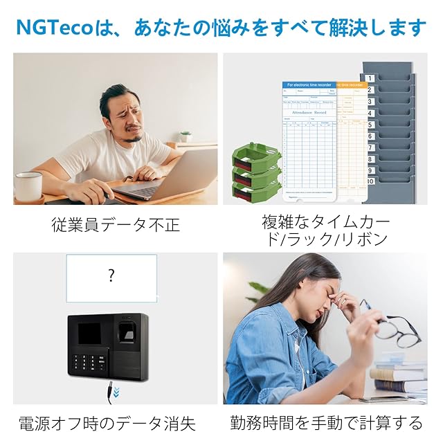 【タイムカード用紙の繰り返しにサヨナラ】NGTecoインテリジェントタイムレコーダーは、最大100個の指紋、10000レコードの容量で、最大50人の従業員を抱える中小企業に最適です。一日6回のチェックインが可能なので。タイムカードやカードホルダーを購入する必要はありません、月額料金0円、無料の8GB USB 付き。電源プラグを差し込んで、マシンと従業員の情報を設定するだけで、長時間に使用できます。