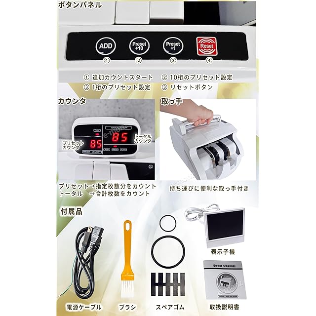【プリセット機能】・カウントしたい枚数を予め設定できます。(デジタル表示の左側が設定枚数。〔Preset+10〕10桁設定〔Preset+1〕1桁設定) 指定した枚数までカウントされると自動でカウントが止まります。