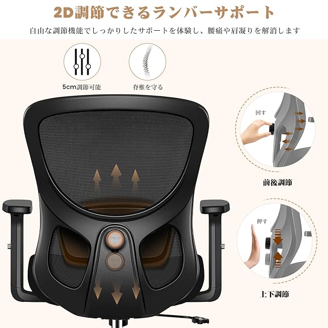 【調整可能性】当社のオフィスチェアは、10cmの上下調整範囲を持ち、異なる身長の人々のニーズに対応できます。90度から135度のロッキング機能を備え、仕事の後にくつろぐことができます。上下および前後に調節可能な2Dランバーサポートが装備されています。