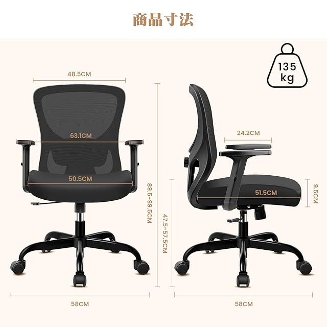 【頑丈で耐久性がある】すべての部品は厳格な家具基準を超えるように慎重に選ばれています。このチェアは、静音のスムーズなキャスターを用い、床を効果的に保護します。それにより頑丈なスチールベースを備えており、椅子を安定性を高めます。最大耐荷重は135kgです。