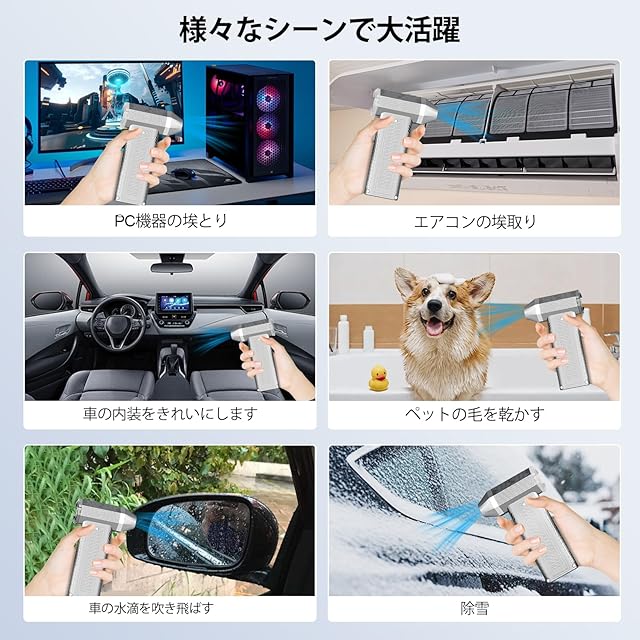 ⚡⚡【一台多役・ 幅広い用途に対応!】電動エアダスターには、3倍の強力な磁石を内蔵し、ノズルがしっかり吸着し、面倒な操作が必要ありません。コードレスでハイパワーなので様々な場所で大活躍!キーボードの隙間、PC周り、卓上、エアコン、火を起こし、車内、窓のサッシ、掃除機フィルター、浮き輪の空気入れ、洗車の后のドライドライ等あらゆる場所で使用可能です。コンパクトなデザインは、持ち運びに便利で、いつでもどこでも強い風を楽しむことができます。
