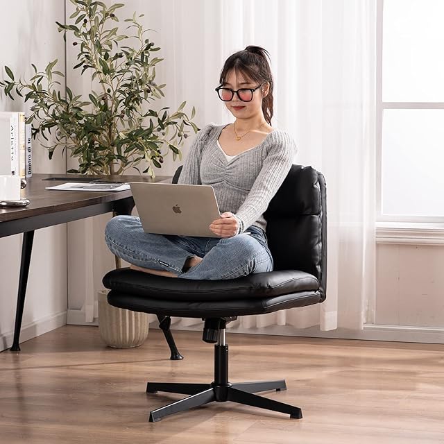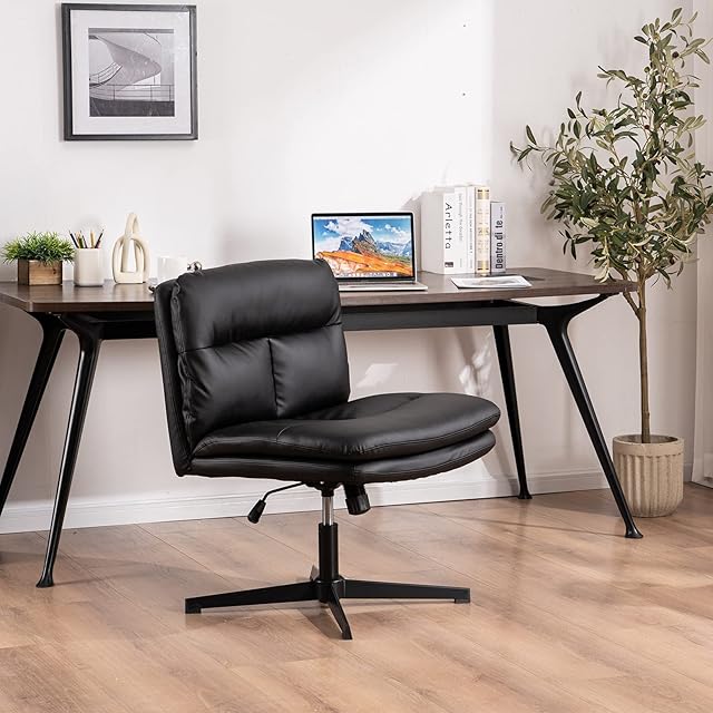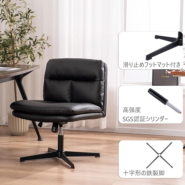 SKYE デスクチェア アームレス オフィスチェア ホイールなし パソコンチェア クロスレッグ 椅子 ワイド ホーム オフィス デスクチェア 高さ調節可能 回転 PUレザー (Black)