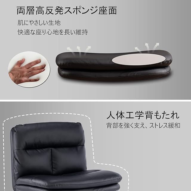 【幅広い柔らかい座面】この肘掛けなしオフィスチェアは幅広い座面があり、同じタイプの座面より30%-50%程度広い、快適にあぐらをかいたり椅子に縮こまったりすることができます。背もたれと座面は高反発バブルで充填され、PUを使って覆われています。二層反発綿でつくられた座面は普通のより緩和性がよい、柔らかくて肌に優しい、快適な座り心地を長く支えます。