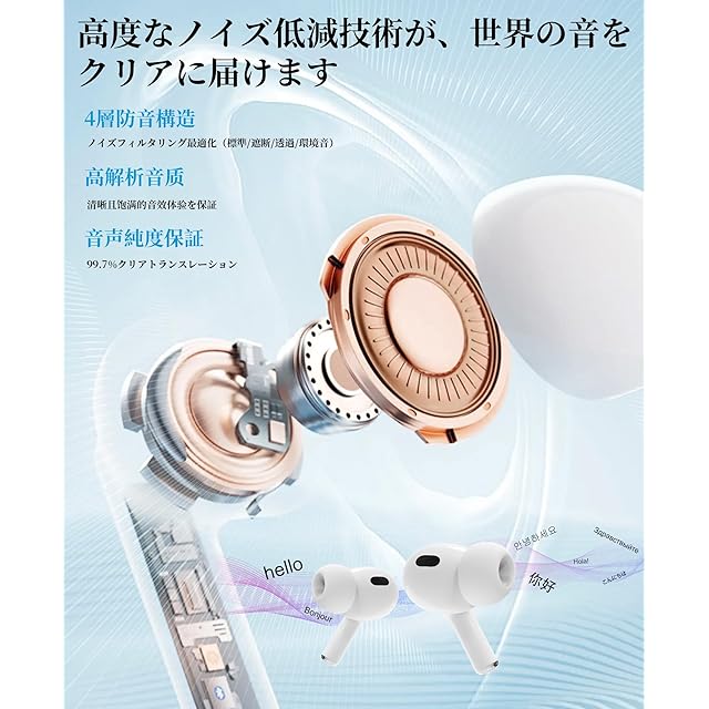 クリアな音声とノイズキャンセリング機能:翻訳イヤホンは、先進的なANC(アクティブノイズキャンセリング)技術を搭載し、4つのノイズキャンセリングモード(標準、ノイズキャンセル、透過音、環境音)を環境に応じて自動調整します。これにより、騒がしい場所でも明瞭な翻訳と正確な音声入力を実現し、シームレスな翻訳体験を提供します。さらに、高解像度の音質により、クリアで豊かな音声をお楽しみいただけます。充電ケースで簡単にノイズキャンセリングモードと音質効果を切り替えることができ、操作性も抜群です。