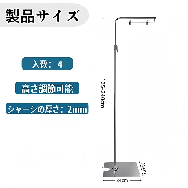 ✅【製品仕様】素材:鉄。 サイズ:パイプ高さ1.25m~2.40m(伸縮式) ・横棒 長さ39cm ・鉄板 34×28cm。 色形:クロームメッキ。 入数: 4。