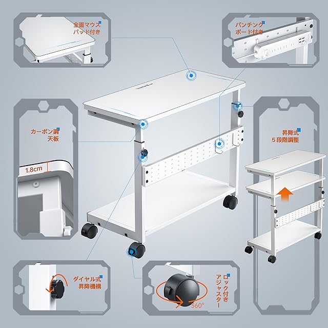 【既存品を改良して新機能を追求】 ダイヤル式高さ調整機構や、取付式パンチングボードなど、使いやすい機能を追求しました。カーボン調天板については厚みを従来比で2割増しにしています。全面を覆うマウスパッドは、高級感にあふれていて贅沢な雰囲気です。高品質キャスター(ロック付き)も搭載されているので、自由な場所に移動・固定して利用できるのも便利です。