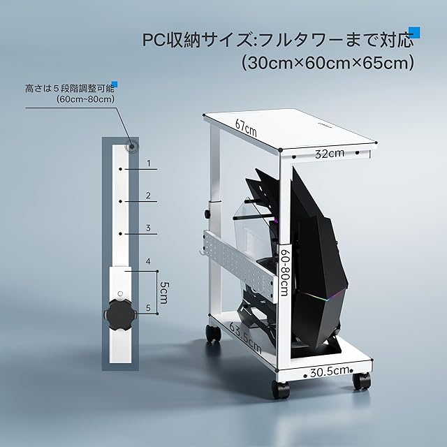 【独創的なコの字構造!安定性や強度、デザイン性を飛躍的に向上させ、PCメンテナンスのしやすさも頂点に】既存PCラックの構造は、4本の支柱を上下の天板に直に取り付ける製品がほとんどでした。U-POWERのPCワゴンは、4本の支柱の代わりに、独創的なコの字構造のスチールフレームで天板を支えています。安定性と強度が高まり、既存製品の欠点をすべて改善しただけでなく、組み立ても簡単になりました。耐荷重量は、大幅アップしました。下の天板はフル活用でき、ほとんどのPC(幅30cmx高さ65cmまで)をスムーズに設置可能です。支柱が邪魔になってしまう既製品と違って、PCをラックから出さずにメンテナンスできます。デザインも抜群であり、一目ぼれしてしまうような見た目も魅力的です。