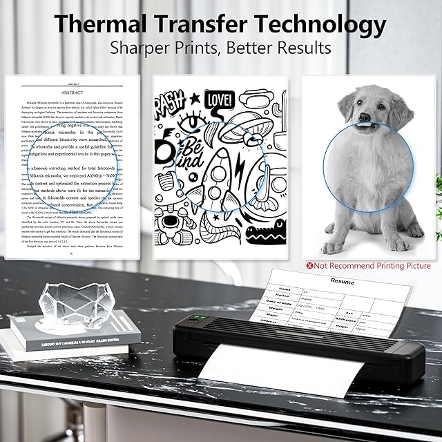 【鮮明な印刷品質と長持ちする定着性】。最大解像度300DPIのポータブルワイヤレスプリンタで、鮮明な印刷を体験してください。従来のサーマルプリンターと比べ、Bluetoothプリンターは先進的な熱転写技術を採用し、目詰まり、インク不足、色あせをなくし、印刷情報を長期間保持します。