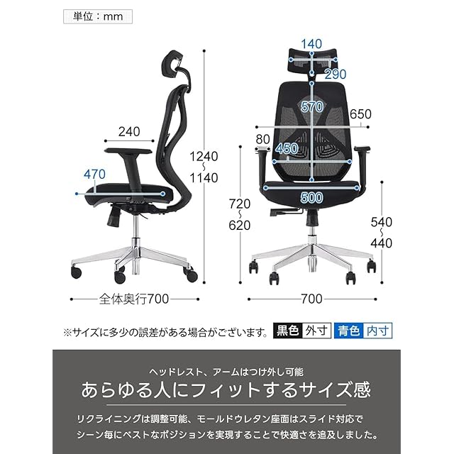 機能:ヘッドレスト・可動肘付き・角度調整、前後スライド、高さ5段階調整
