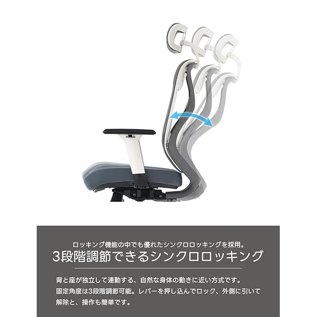 機能:上下昇降、座面位置調整(スライド機能) 、背座シンクロロッキング機能&3段階固定可能 、ロッキング強弱調節機能