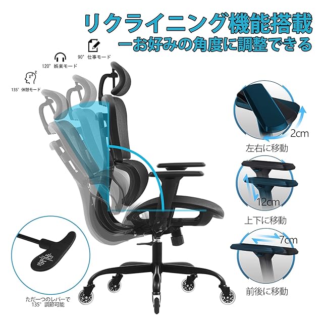 KERDOM ワークチェア 全面メッシュチェア オフィスチェア リクライニングチェア 人間工学椅子 デスクチェア テレワーク 3Dアームレスト 可動式ヘッドレスト ロッキング 360度回転 多機能 通気性 事務 おしゃれ ブラック KD968ZK-Black