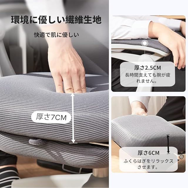 「弾力座面&高品質素材」厚さ7cmのスポンジクッションはソフトで心地よく、ヒップカーブにフィットするデザインで、お尻と太ももの圧力をうまく分散し、血行を促進します。長時間座って仕事をすることによる体調不良も大いに改善します。椅子のヘッドレストと背もたれは高品質のメッシュで作られており、肌に優しく、耐久性があります。