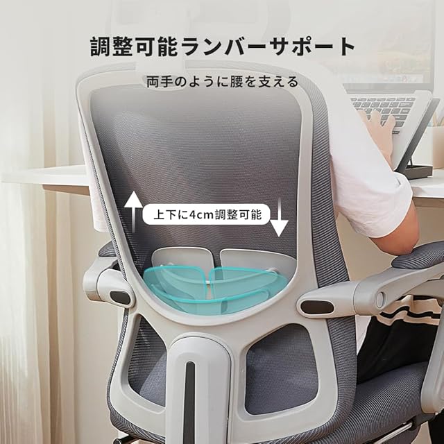 「S字型背もたれ&調節可能なランバーサポート」人間工学に基づいて設計されたS字型の背もたれが背中全体を包み込み、仕事中でも寝転んでも肩や背中にかかる圧力を分散し疲労を軽減します。手のような2ゾーンのデザインのランバーサポートは、上下4cm自由に調整でき、腰部を的確にサポートし、腰痛を予防します。ユニークなデザインはメッシュで輪郭を包み込み、正面からはベゼルがほとんど見えず、美しさを際立たせます!