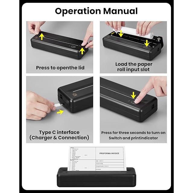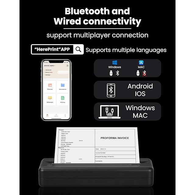 【Bluetoothワイヤレスプリンター】このモバイルプリンターを使用して、スマートフォン、タブレット、ノートパソコン、PCから簡単に印刷できます。モバイル電話とのBluetooth接続とコンピューターとのType-C接続をサポートし、Bluetooth経由でのシームレスな印刷には「HerePrint」アプリが利用できます。このプリンターでファイルを簡単に接続して印刷するのに、1分未満の時間しかかかりません。内蔵バッテリーにより、最大9時間の印刷可能な電池の動作時間でワイヤレス印刷が可能です。(注:スマートモバイルデバイスでは印刷のために「HerePrint」アプリが必要ですが、PCユーザーは公式ウェブサイトからドライバーをインストールできます。)