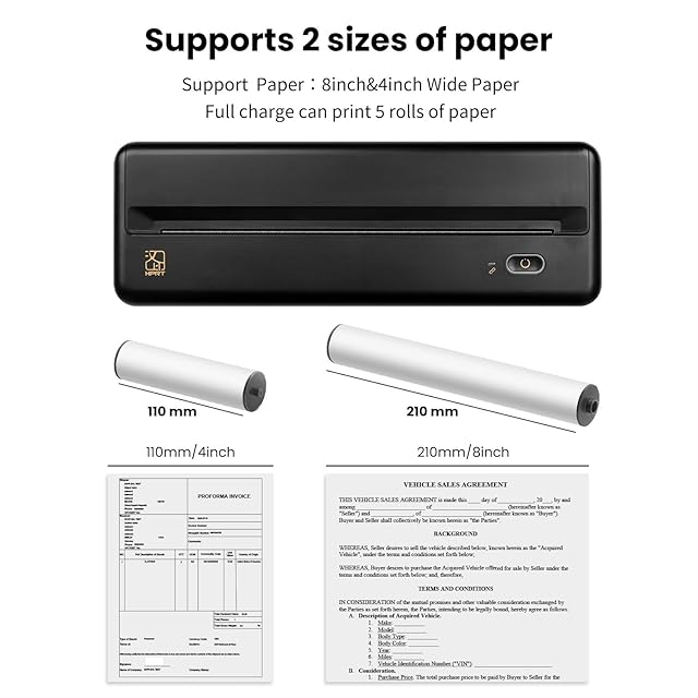 【2サイズの用紙に対応可能】110mmや210mmの感熱ロール紙を両方とも使用できます。製品には210mmの感熱紙が1ロール内蔵されており、約24枚のA4用紙に相当します。【ミニポータブルプリンター】HPRT M810 小型熱転写プリンターのサイズは、10.6"X3.74"X1.97"と小さくコンパクトです。このモバイルプリンターは、旅行、オフィス、自宅、車、大学、タトゥースタジオなど、様々な場面で活躍します。