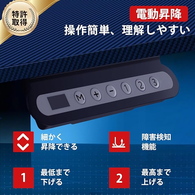 【強力なドライブ - スムーズな昇降】効率的な電動システムにより、静かで安定した昇降が可能です。作業中も集中しやすく、そのため全体的な作業効率が向上します。最大負荷時でも音量は48デシベル以下で、安定性を維持します。【使いやすい電動昇降コントロール】ボタンは4つしかなく、複雑ではありません。上下の矢印ボタンを押し続けると、昇降できます。1を押すとデスクが自動的に下降し、2を押すと自動的に上昇します。