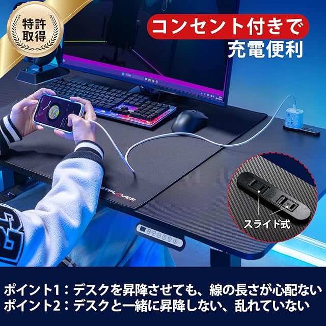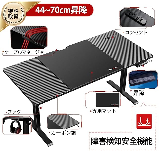 GTRacing ゲーミングデスク パソコンデスク pcデスク ローデスク 電動 昇降式デスク 静音 速い 安定昇降 デスクマット付き フック付き ケーブルマネージャー付き コンセント付き 耐荷重80kg 幅110cm×奥行55cm×高さ46~72cm(2cm天板を含めて) 人間工学 カーボン調 電動式昇降デスク GTS111-110-CFBLK