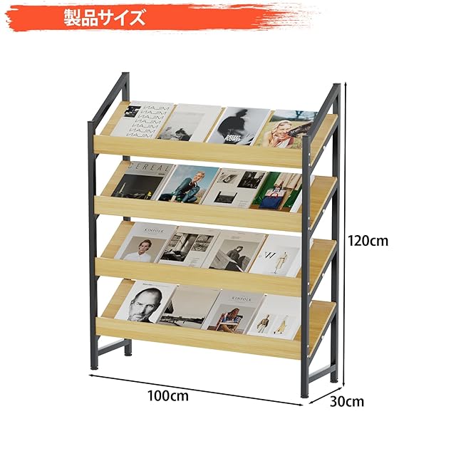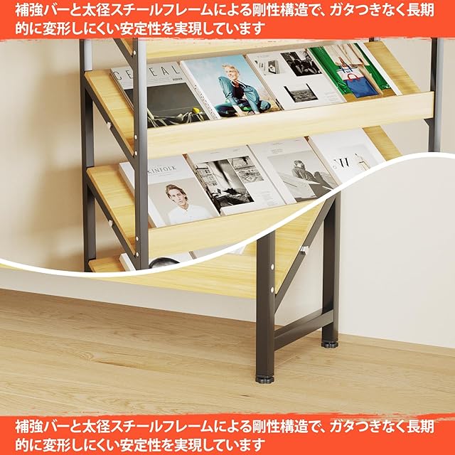 【大容量で見やすい収納】多層のオープンデザインにより、必要な書籍や雑誌が一目で探せ、取り出しも素早くスムーズ。傾斜した層板と幅広のバッフルを組み合わせたこだわりの設計で、物が落ちる心配がありません。また、層板の高さは最適化されており、背の高い方でも腰を深く曲げることなく、快適に収納・取り出しができます。