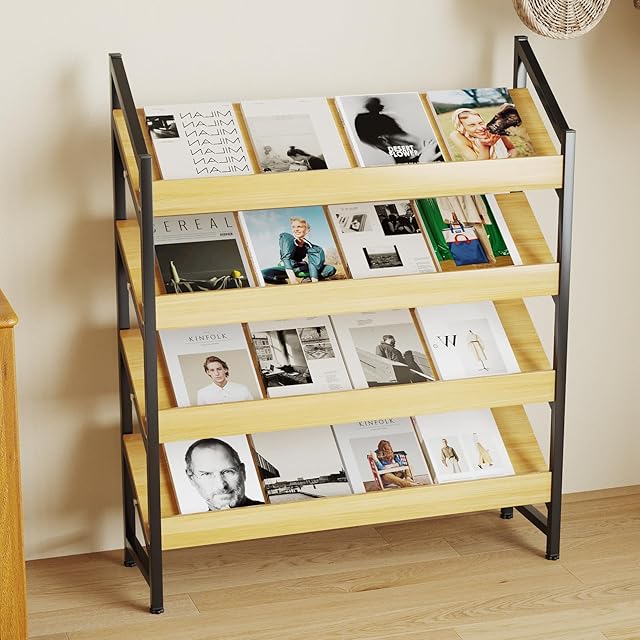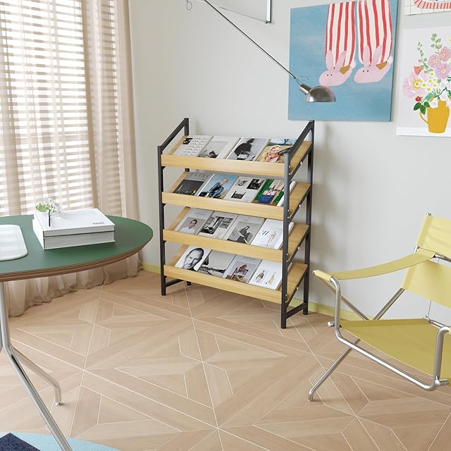 マガジンラック 雑誌ラック スタンド カタログスタンド チラシスタンド 4段 省スペース、大容量収納 木とスチール製 オープン型書籍展示架 オフィス・家庭用 丈夫な強化構造 補強バーと太めのスチールフレームでガタつき・変形防止 環境保護塗装で汚れも簡単に拭き取れる 商業・家庭両用で幅広いシーンで活躍する多用途収納棚(120×30×120cm 浅胡桃色xブラック)