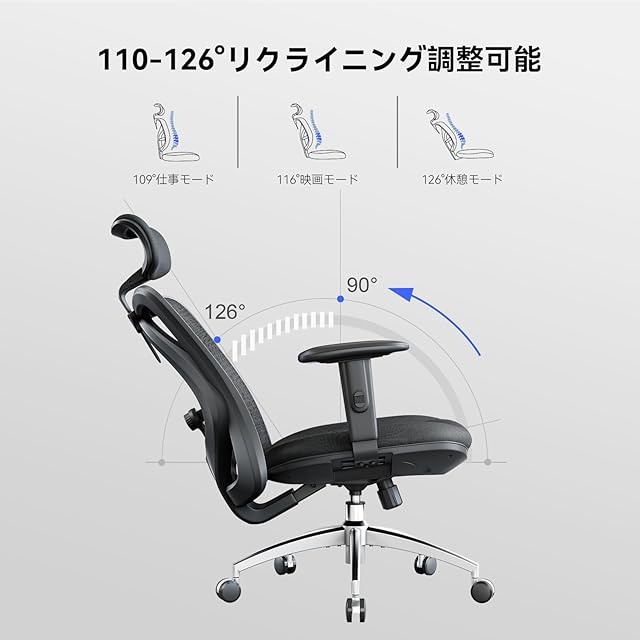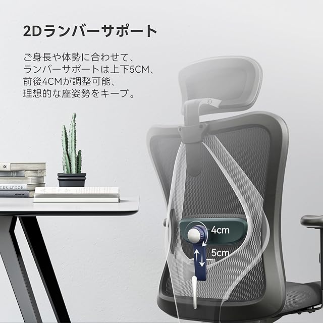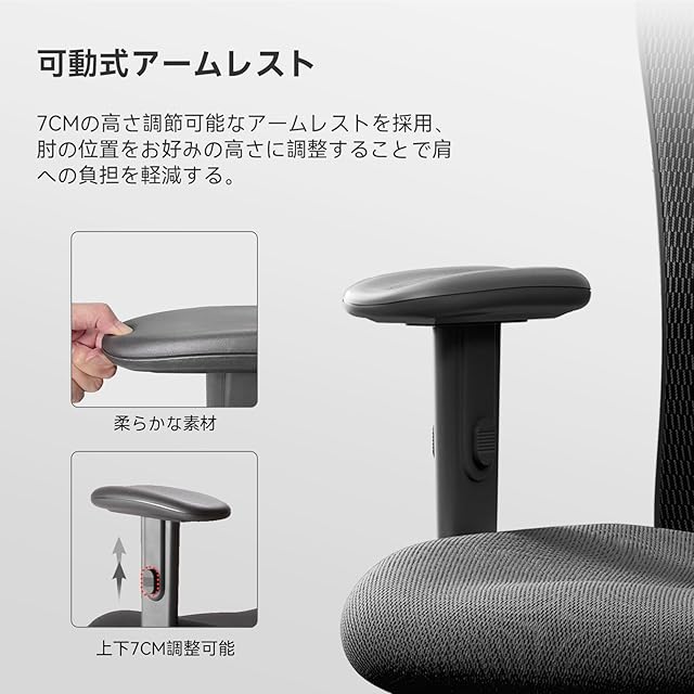 「人間工学設計椅子&様々な調整実現」SIHOOは長年に人間工学と人の座姿勢を研究し、長時間に座っても疲れない人間工学椅子を開発します。SIHOO M18 オフィスチェアは2Dヘッドレストを採用して9cm上下昇降可能で45°角度調整でき、自分に適する高さや角度を調整して完全に頭部や首を支えることができます。そして、デスクチェアのランバーサポートも二種の調整機能があり、上下方向5cmと前後方向3cmの調整が可能でしっかり腰をサポートできます。従来品と違って、SIHOO M18 デスクチェアは7cm上下昇降機能のアームレストを搭載し、体型やデスクの高さに合わせて調整し、肘を置いた状態でデスクワークをすることで肩こりの予防にもお役に立てます。