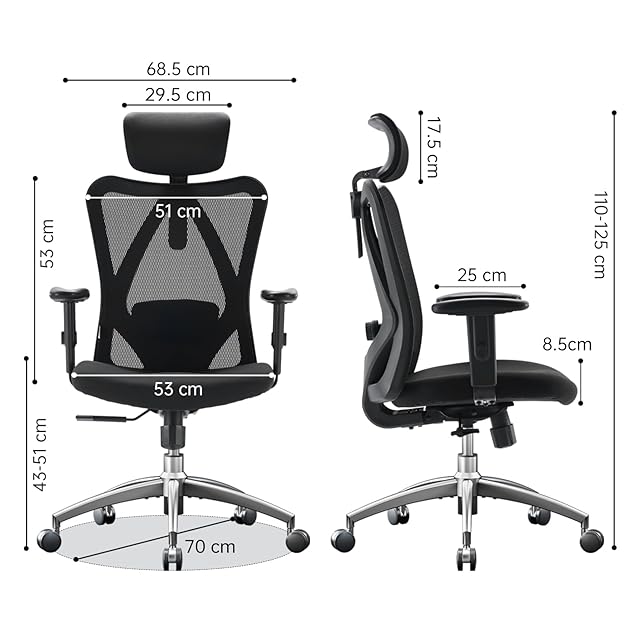 「商品仕様&簡単に組立可能」SIHOO M18 椅子の寸法は幅68.5、奥72、椅子の高さ109-130cmです。座面昇降は43-53cmで日本人の体格に合わせて座りやすい座面高こだわりました。10cm上下昇降機能ができて様々な身長の人に応じて調整できます。ワークチェアの重量は16kgで、 耐荷重が150KG可能です。また、椅子には組み立て道具、日本語説明書、補足部品と手袋がついています。誰でも20分以内に七つのシンプルステップでこのハイバックチェアを組み立てることができます。