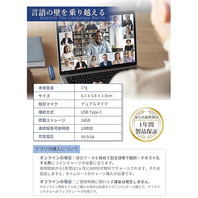 【アプリ内購入について】オンラインモード:ご使用開始から1年の間は、月間で600分の無料使用が可能です。超過した場合はアプリ内でコインチャージが必要となります。オンラインモデルで、オフラインモードを使用する場合はオフライン翻訳パッケージの購入が必要となります。オフラインモデルをご購入の場合は、ご使用開始から1年以内でしたら機種変更をされた場合などに、オフライン翻訳パッケージ用のPINコードの再発行が可能です。