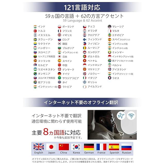【最大121言語の翻訳が可能】 Wooask+S01は、最大121言語の翻訳が可能です。 59カ国に加えて62の方言アクセントに対応。Wooask+S01の最大の特徴「オフライン翻訳」は、以下8カ国の翻訳が可能です。 (オフライン対応言語:英語、日本語、中国語、ドイツ語、スペイン語、フランス語、ロシア語、韓国語)