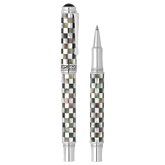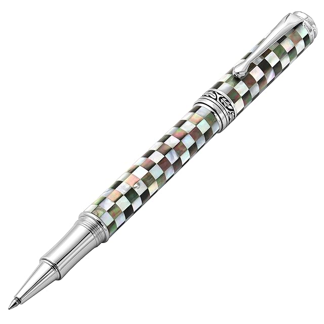 ゼゾ マエストロ ジュビリー ローラーペン, ファインポイント. オーシャニックホワイトマザーオブパールとイリデッセントブラックタヒチマザーオブパール貝のチェッカー。223本限定生産。同じペンは2つとない
