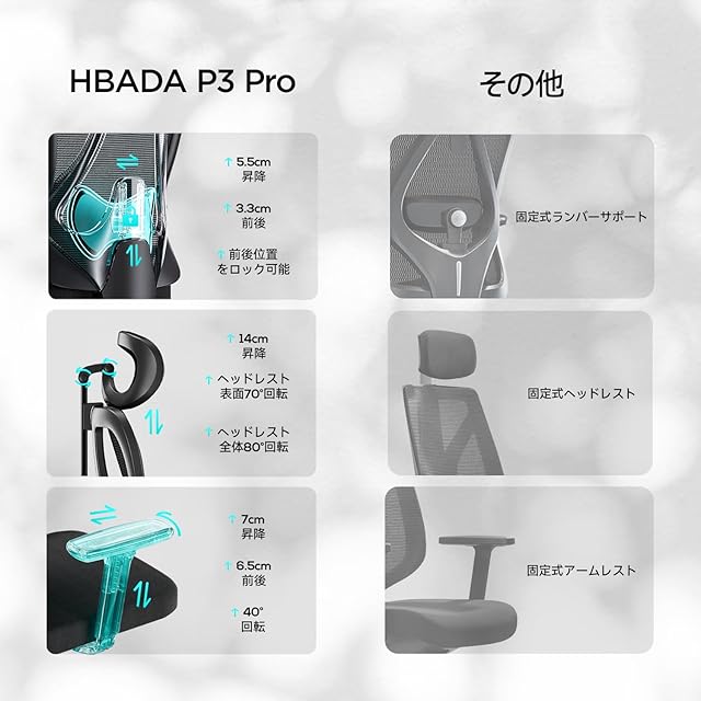 【人間工学設計・多重調整】HBADA は長年に革新的な技術と人間工学設計に基づく健康的なライフスタイルに専念しています。アップグレードされたHBADA P101のランバーサポートは5.5cm昇降と3.3cm前後調整でき、腰に応じて自由に調整し、より正確にサポートします。
