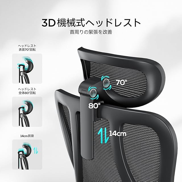 【3Dヘッドレスト】表面70°回転、全体80°回転、昇降14cm調整できます。