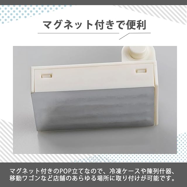 【マグネット付きで便利】マグネット付きのPOP立てなので、冷凍ケースや陳列什器、移動ワゴンなど店舗のあらゆる場所に取り付けが可能です。またクリップ部分は180度の角度調節ができるため、様々なPOPに対応します。