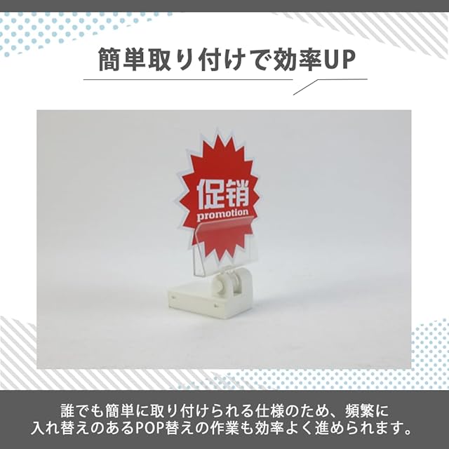 【簡単取り付けで効率UP】誰でも簡単に取り付けられる仕様のため、頻繁に入れ替えのあるPOP替えの作業も効率よく進められます。クリップ幅も変えられるので、厚手のPOPでも取り付けやすいです。