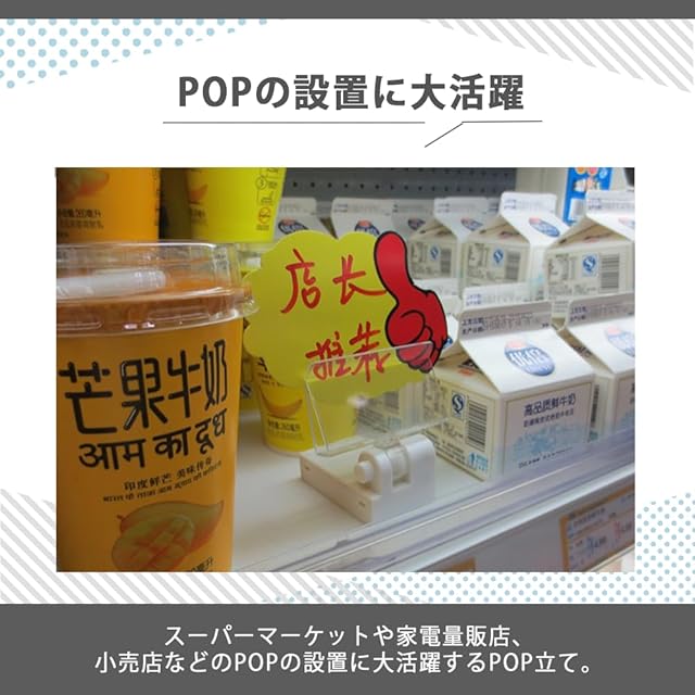 【POPの設置に大活躍】スーパーマーケットや家電量販店、小売店などのPOPの設置に大活躍するPOP立て。マグネット部分はホワイトカラー、クリップ部分はクリアとシンプルなデザインなので、POPをしっかり目立たせてくれます。50個セットでコスパも抜群です。