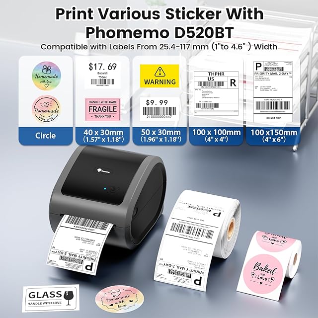 Phomemo D520BT A6 ラベルプリンター サーマルラベルプリンター Bluetooth接続 4"x6"多機能ラベルプリンター Ebay/Shopify/日本郵便/倉庫/郵便/配達/食品表示に適用 高速連続印刷 1"-4.6"幅 スマホ対応 USB PC対応 はいいろ 2又の日本用プラグ