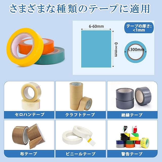 【幅広い用途】自動テープディスペンサーはクラフトテープ・oppテープ・和紙粘着テープ・ビニールテープ・アルミテープ・布テープなど様々なテープを自動送り・自動カットできます。(ご注意:粘着性が強すぎるテープには適用しません)一回に切断長は最大999mmに対応ができます。対応なテープ幅は6-60mmです。