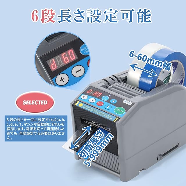 Frifreego 電動テープカッター 自動テープカッター 最大切断長さ999mm 長さ設定可能 適用テープ幅6-60mm 自動/手動モード 物流 保管 梱包用品 工場 業務用