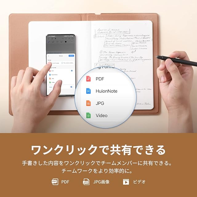 【手書きメモを即デジタル化】❶スマホに連動:アナログのノートに書いたものがリアルタイムでスマホにそのまま表示され、電子メモとして保存されることができる。❷オフラインストレージ:スマホに接続されずノートに書き込んだ内容でも、後からスマホに保存することができる。❸ワンクリック共有:手書き文字をPDFや画像やビデオなどのデジタル形式でワンクリックでチームメンバーに共有できる。※HUION NOTEアプリが必要。対応OS:iOS 11.0以降、Android 6.0以降、HarmonyOS