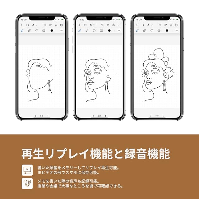【リプレイと録音機能】❶書いた順番をメモリーして後でリプレイ再生可能。どの順番で記載したのか、どのようにイラストや漫画を描いたのか、一筆ずつ作成過程を再現することができる。ビデオの形でスマホに保存されることもできる。❷メモを書く際の音声も記録可能。授業や会議で大事なところを聞き落としたり、メモするスピードが遅かったりすることがよくある。録音機能によって、大事な内容を後で確認し、一字一句漏らさないことが可能になった。※HUION NOTEアプリが必要。