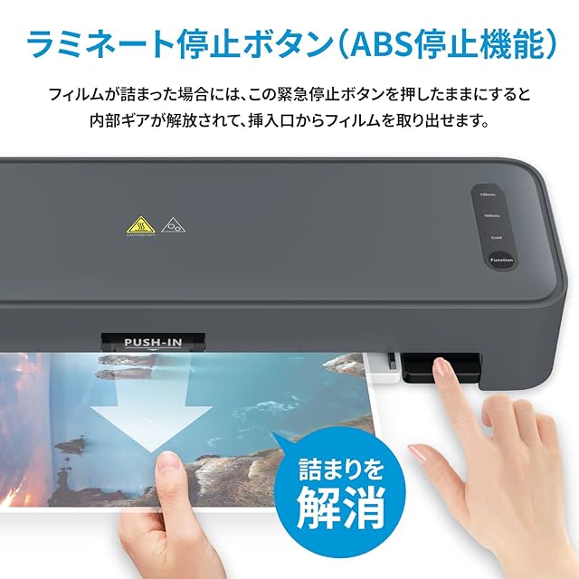 【チラシや写真の美しさを守る】ラミネートすることで色落ち、破損を防ぎ耐水性もあるため、チラシや写真などの破損を防いで美しさを守ります。パウチフィルムは100~150ミクロンまでの厚みに対応。フィルムが詰まった際も、緊急停止ボタンで取り出せます。