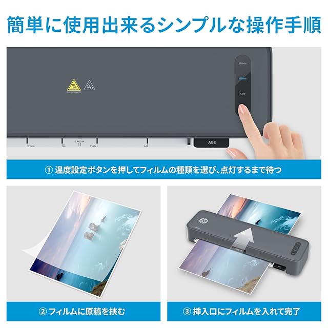 【簡単3ステップの使用方法】①温度設定ボタンを押して、フィルムの種類を選び、点灯するまで待ちます。②フィルムに原稿をはさみます。③挿入口に入れて完了。 / 加工直後のフィルムの反りを防ぐ反り防止トレー付き。