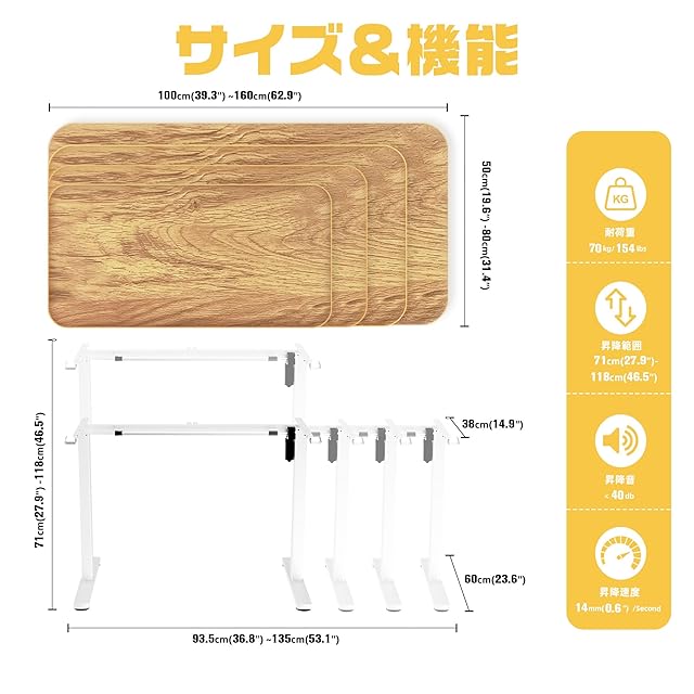【商品仕様】製品名:昇降デスク フレーム 昇降範囲:71-118CM 昇降スピード:14mm/秒 耐荷重:70kg 本体サイズ:幅95-135CM調節可能*奥行38CM*高さ71-118CM調節可能 本体重量:15KG 本体材質:鋼鉄合金 適用天板サイズ:幅100~160cm、奥行50~80CM。
