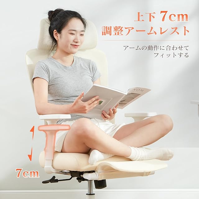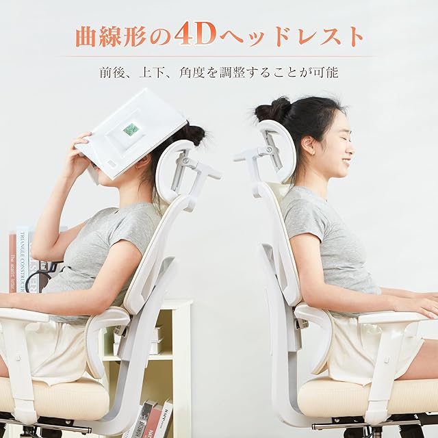 【3Dヘッドレスト・頭の動きに合わせる】頭の重さは体重の約10%と言われており、長時間使用するワークチェアは頭部を適切に支えることが大切です。UPHYBは高弾力のヘッドレストで、どのような姿勢で座っても、頭と頸部をゆったり預けることができます。前後調整、さらに上下高さ5段階に調節可能でご自分のお気に入りに調整できます。さらに角度調整機能があって、頭の動きに合わせたり連動する。