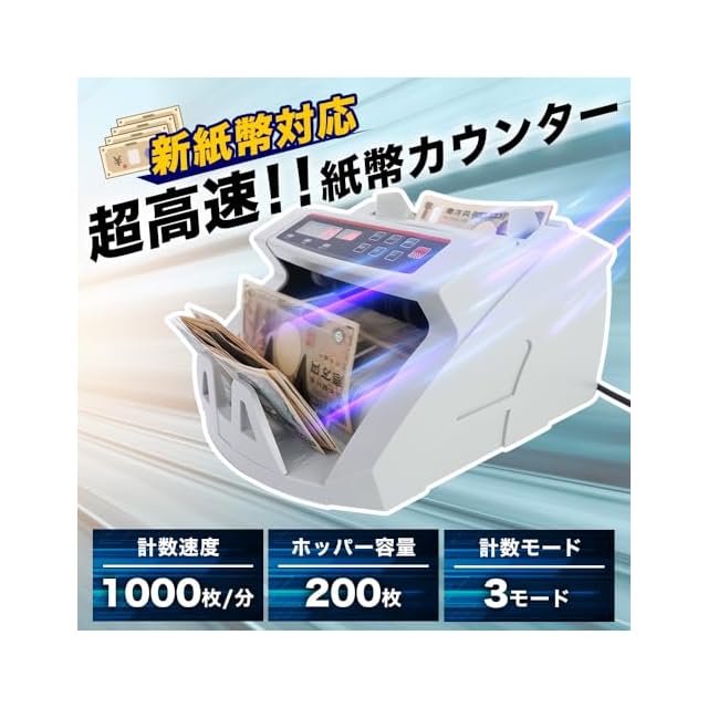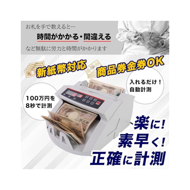 【新紙幣対応、100万円をわずか8秒でカウントするマネーカウンター】 超高速スピードで紙幣を数えるマネーカウンターです。 お札を投入口に置くだけで枚数を数えます。 あらかじめ決められた枚数をカウントするモード、累積枚数を数えるモードなど3モードを搭載。 新紙幣の計測ももちろん可能で、各国紙幣や商品券、金券等も数えることができます。