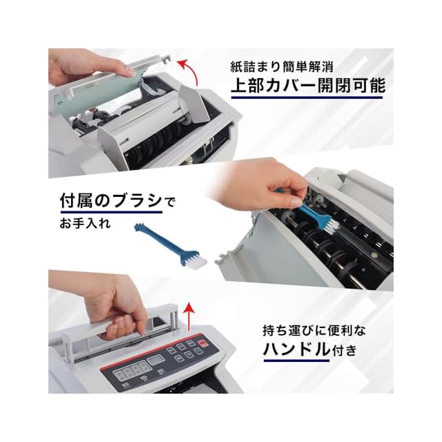 【紙づまりも簡単に解消】 万が一紙幣が中で詰まってしまった場合でも、上部カバーを開けて取り除くことができます。 お手入れは、付属のブラシで計数センサーのほこりを取り除いてください。