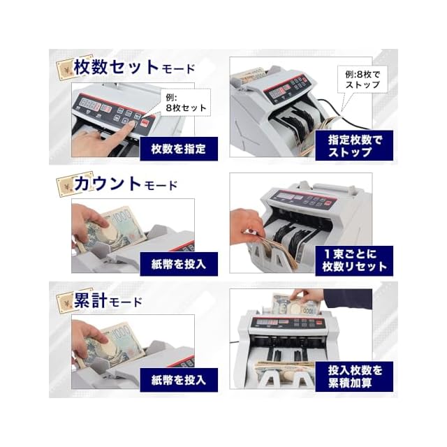【3モード搭載】 電動オート紙幣カウンターには枚数セットモード、カウントモード、累計モードの3モードを搭載しています。 枚数セットモードは、指定した枚数をカウントすると停止するモードです。 カウントモードは1度に投入した紙幣枚数をカウント。 投入ごとにカウントをリセットします。 累計モードは、小分けにされた札束を1束、1束別々に投入しても合計枚数を数えるモードです。