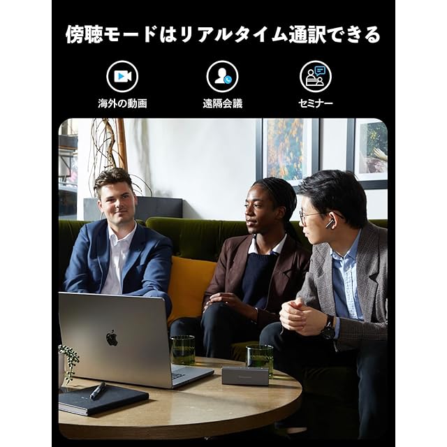 【傍聴モードは海外動画や遠隔会議など適応】X1翻訳機はPC、スマホなどの電子製品からの音源に近づけて、本体の画面には対訳内容を表示し、イヤホンには翻訳の音声が流れます。戻るボタンを長押しして、簡単な会話が可能です。 また、「オリジナル音声真似」機能は、オリジナル音声を真似して、対訳テキストとオリジナル音声録音がある会議メモを作成し、遠隔会議や外国語授業などの場合に適しています。